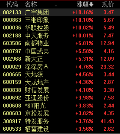 地产股盘中走高,广宇集团、中天服务、三湘印象等4股涨停。