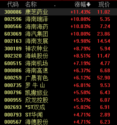 具体来看,海南自贸区概念走强,海南瑞泽、海南海药、海汽集团等多股涨停。