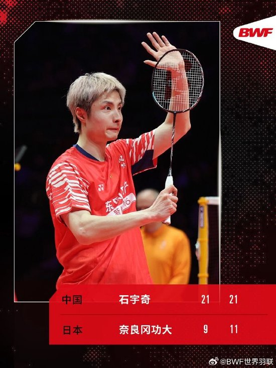 石宇奇2比0战胜奈良冈功大,比分21-9、21-11。以三战全胜、小组第一的战绩晋级半决赛。