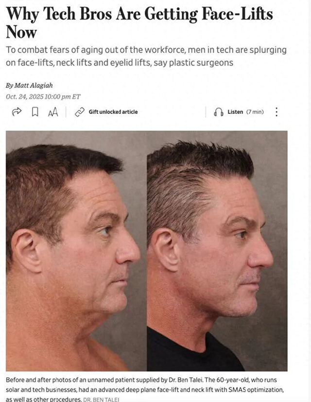 近期,一项来自《华尔街日报》的报道指出,过去半年间,硅谷整形外科诊所的预约量激增40%,其中三分之二的客户来自科技公司,平均年龄不足35岁。